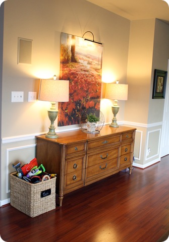 Fast forward to one day a few weeks ago. While sitting in our family room, I gazed over at the lovely dresser (another Craigslist find) and thought to myself,